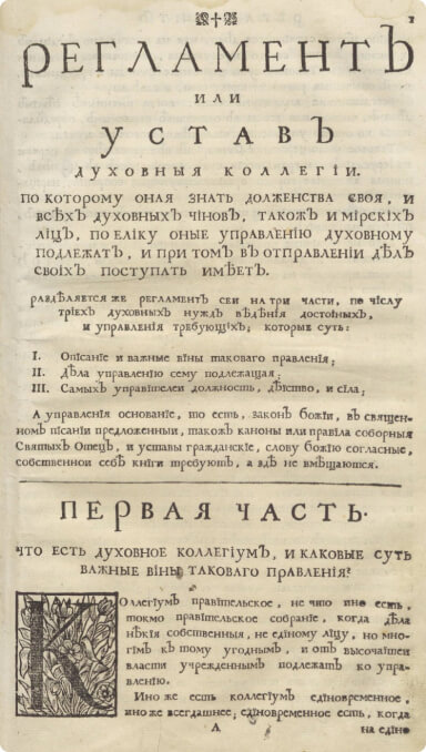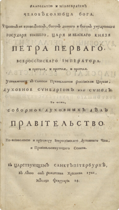 Петр I учреждает Святейший синод. Картина Ивана Тупылева. 1801. Омский областной музей изобразительных искусств имени М. А. Врубеля